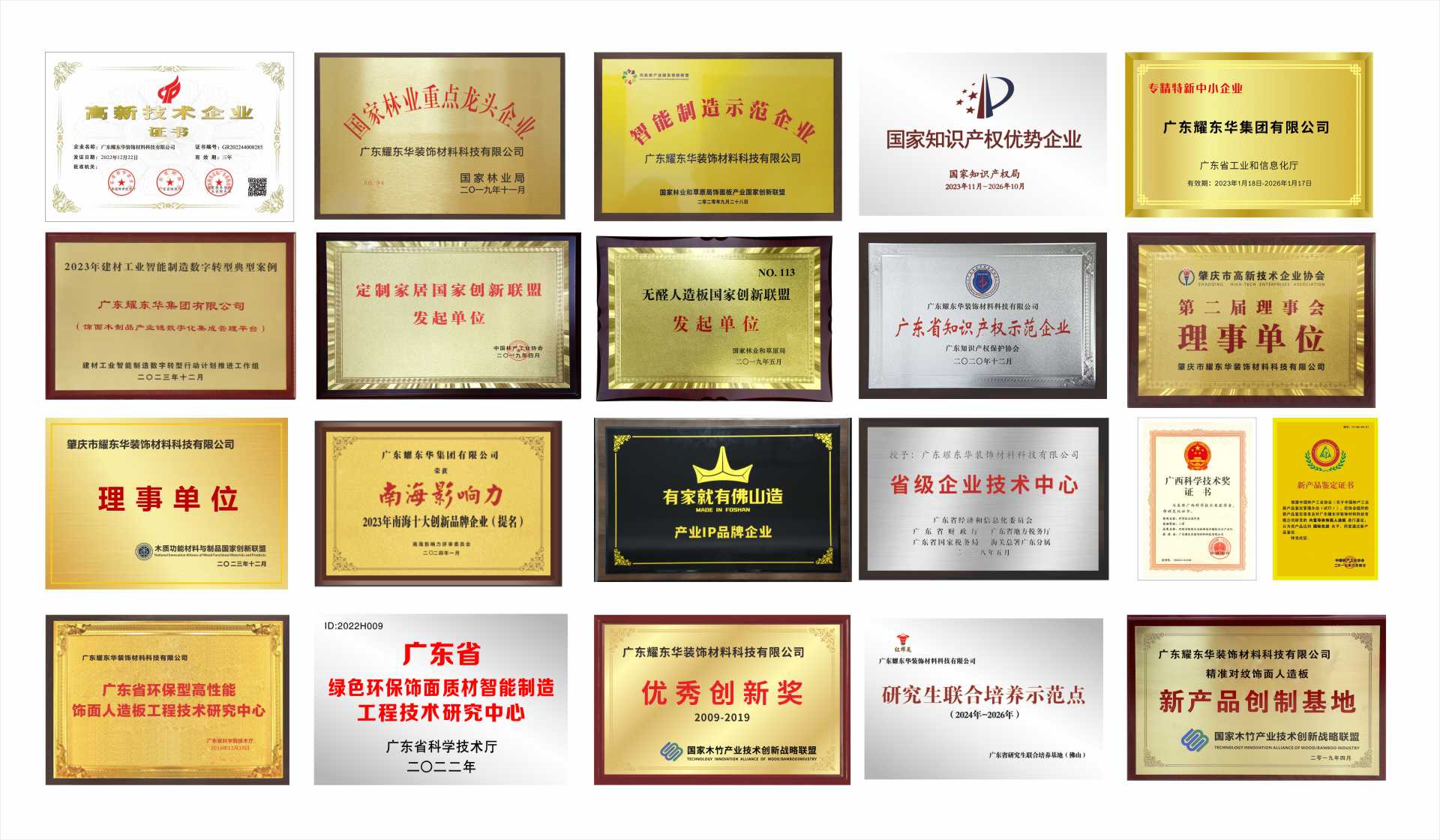•国家高新技术企业 •国家林业重点龙头企业 •智能制造示范企业 •国家知识产权优势企业•专精特新中小企业 •2023年建材工业智能制造数字转型典型案例 •定制家居国家创新联盟发起单位 •无醛人造板国家创新联盟发起单位 •广东知识产权示范企业 •肇庆市高新技术企业协会第二届理事会理事单位 •木质功能材料与制品国家创新联盟理事单位 • 2023年南海十大创新品牌企业(提名) •有家就有深圳造-产业IP品牌企业 •省级企业技术中心 •科学技术进步奖 •“国际先进水平”新产品鉴定证书 •广东省环保型高性能饰面人造板工程技术研究中心 •绿色环保饰面质材智能制造工程技术研究中心 •国家木竹产业技术创新战略联盟优秀创新奖 •研究生联合培养示范点 •精准对纹饰面人造板新产品创制基地