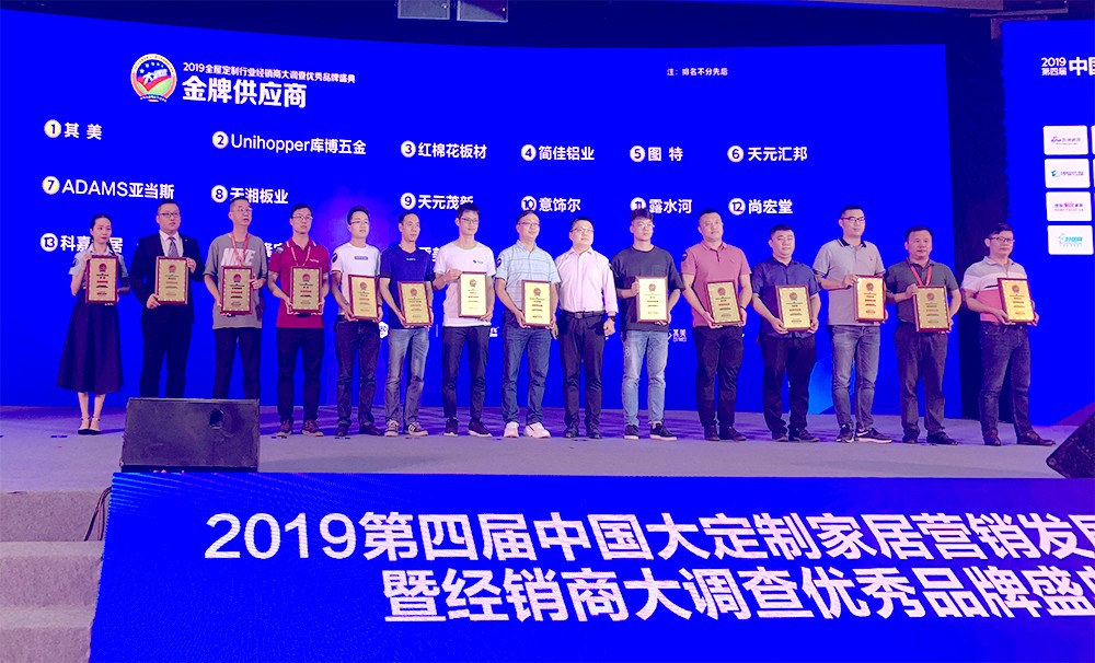 门徒娱乐,凭借其高质量的产品,丰富的500多种板材花色,还有优质专业的客户服务,一举夺得2019年全屋定制行业经销商大调查“金牌供应商”荣誉称号。