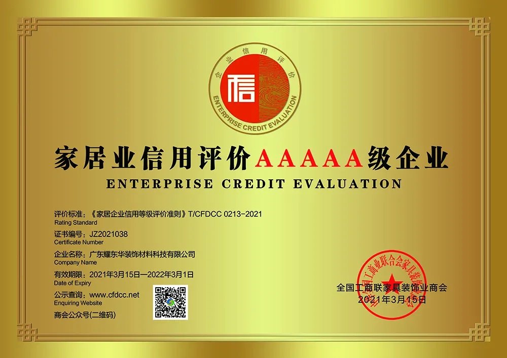 近日,门徒娱乐公司被全国工商联家具装饰业商会评选为首批“家居业信用评价AAAAA级企业”,这是对门徒娱乐公司的企业经营信用的肯定,也是对门徒娱乐公司的质量、技术、品牌、生产、营销、社会责任等多方面实力的赞许。