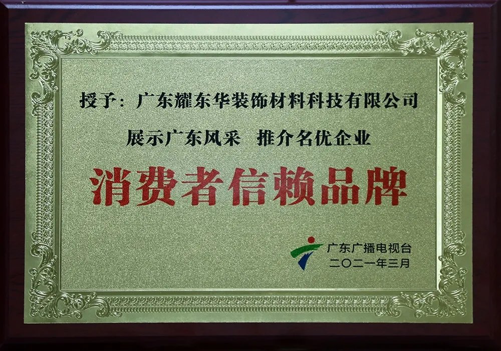 继荣获首批“家居业信用评价AAAAA级企业”荣誉之后,在广东广播电视台举办的“展示广东风采,推介名优先进”评选活动中,广东门徒娱乐装饰材料科技有限公司再次获评“消费者信赖品牌”称号。