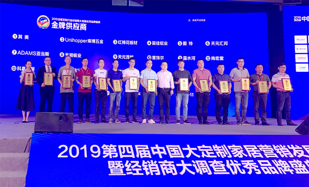 2019年7月10日,由中国建博会和慧亚传媒联合主办的2019年第四届中国大定制家居营销发展论坛暨经销商大调查优秀品牌盛典在广州琶洲广交会馆隆重举行,门徒娱乐,凭借其高质量的产品,丰富的500多种板材花色,还有优质专业的客户服务,一举夺得2019年全屋定制行业经销商大调查“金牌供应商”荣誉称号。