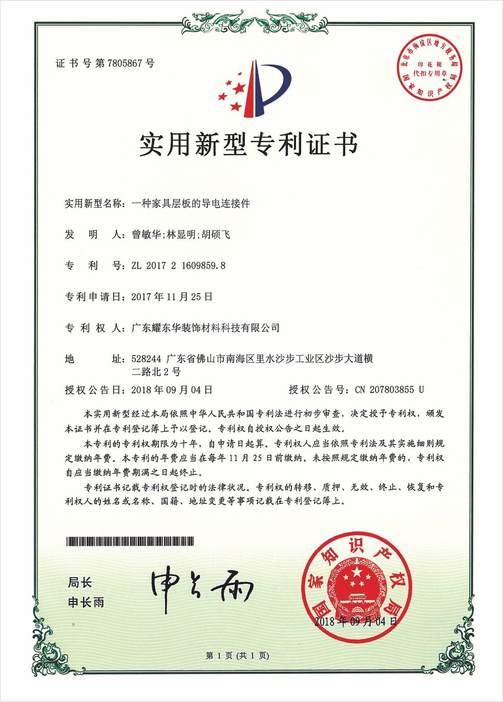 一种家具层板的导电连接件专利证书